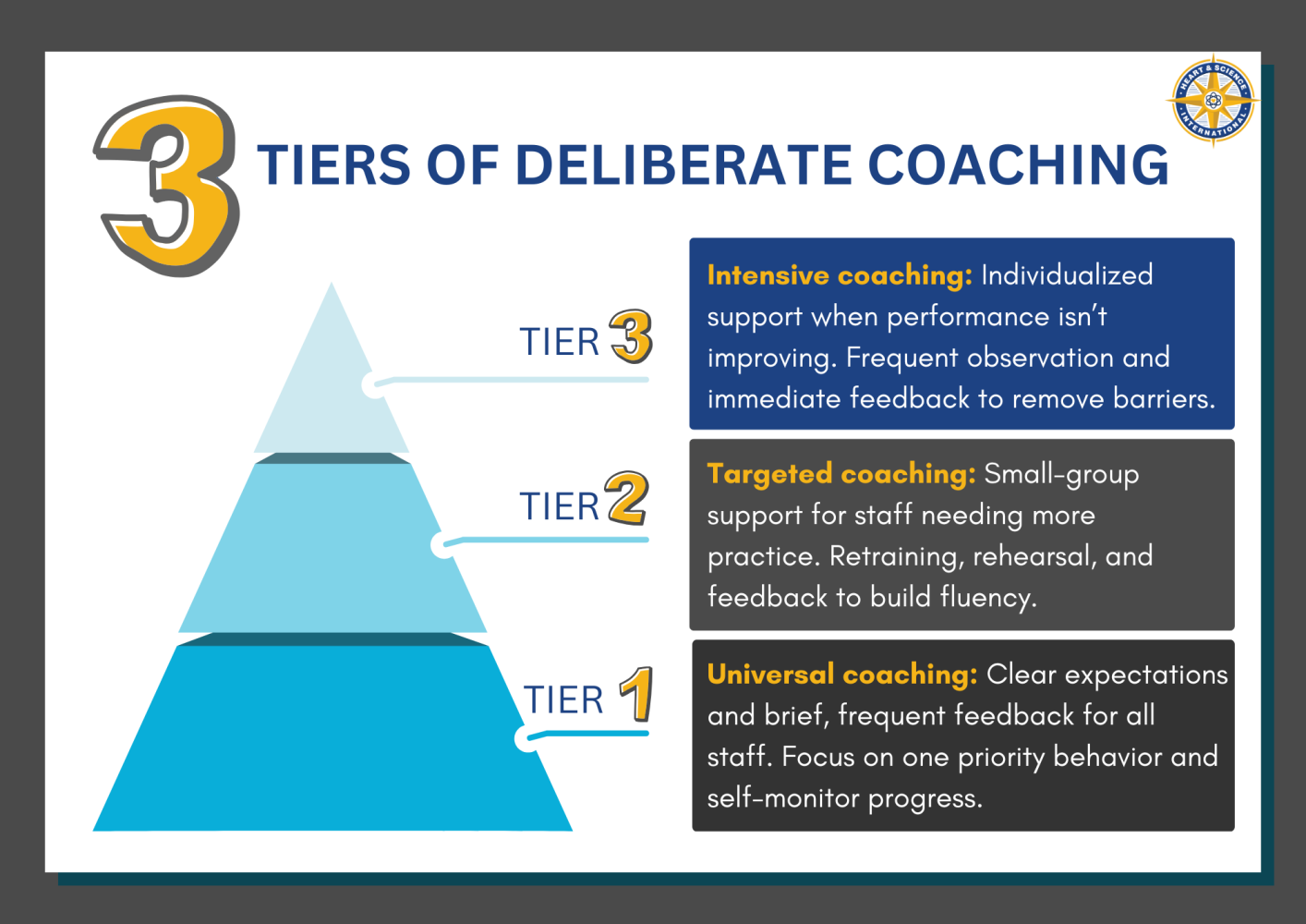 Instead of managing performance a few times a year, deliberate coaching creates short feedback cycles, clear performance targets, and visible progress. A practical way for schools to think about this is through a three-tier coaching model.