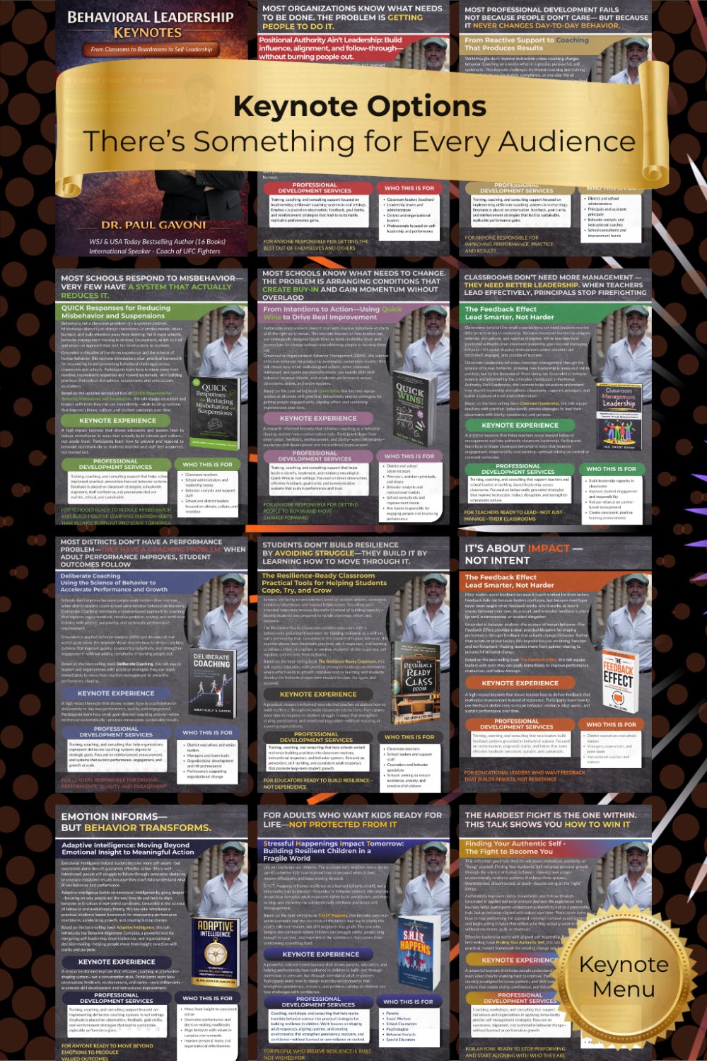 There’s something for every audience. Leadership isn’t about a title. It’s about influence, alignment, and understanding the science of human behavior that drives performance at every level. My keynotes and training are built around the practical frameworks from my books and are designed to help educators, leaders, and organizations turn inspiration into action.